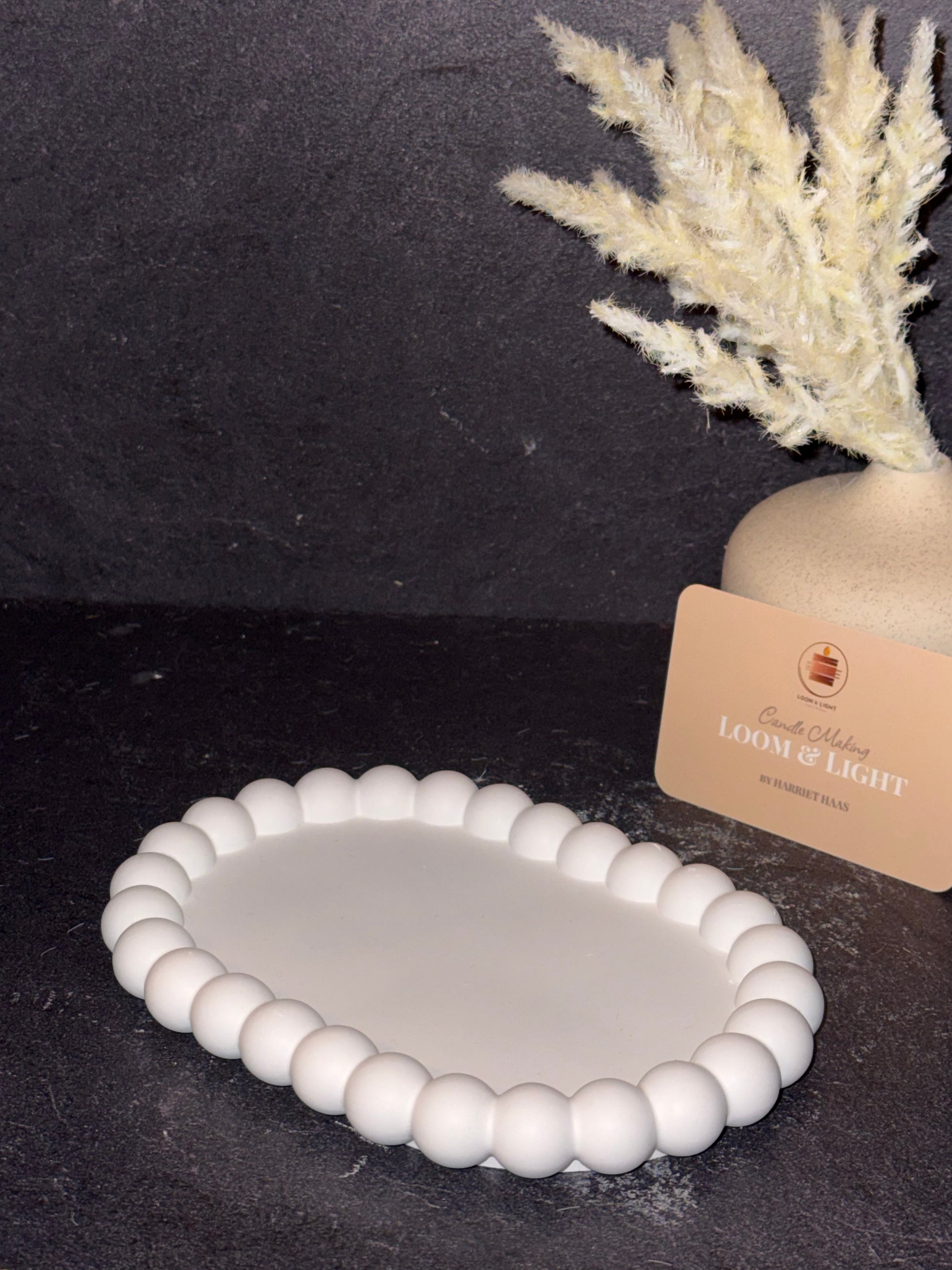 Der handgegossene Bubble-Untersetzer in ovaler Form ist ein stilvolles Accessoire, das Funktionalität und Design harmonisch verbindet. Der markante Kugelrand sorgt für eine moderne, edle Optik und macht den Untersetzer zu einem besonderen Highlight für deine Loom&Light-Kerzen.